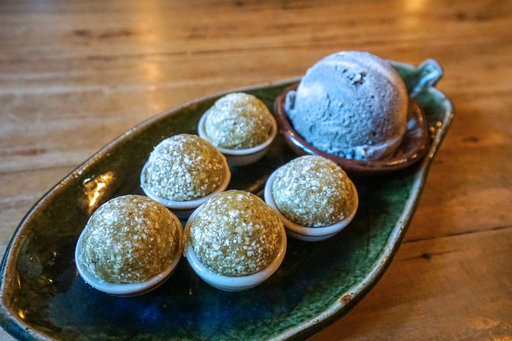 ส่วนของหวานต้องลองข้าวตอกตั้งเจลาโต เป็นการนำขนมไทยโบราณไส้มะพร้าวมาเสิร์ฟพร้อมไอศกรีมเจลาโตรสชาติเป็นเอกลักษณ์ เช่น รสไข่เค็มบ้านตลาดน้อย รสงาดำถั่วเหลือง เป็นต้น