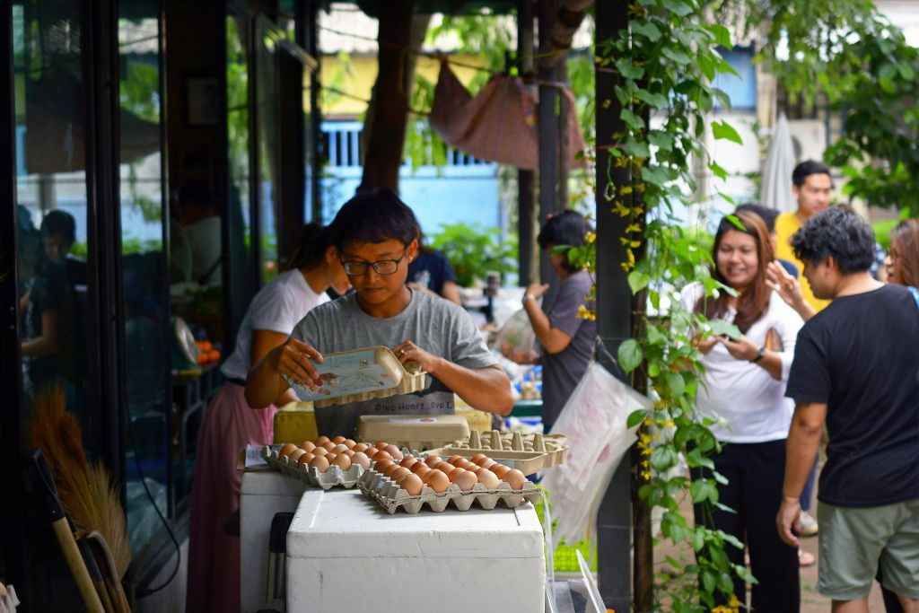 วันปันอยู่ปันกินเป็นตลาดเล็กๆ แต่อบอุ่นเป็นกันเอง บรรยากาศแบบสวนในเมือง ร่มรื่นเย็นสบายท่ามกลางแปลงผัก เล้าไก่ เล้าเป็ด และไม้ผลยืนต้น มีเสียงเพลงอะคูสติกจากเพื่อนๆ บรรเลงคลอ มาเดินตลาดนี้จึงได้ทั้งช็อปชิมและชิลล์ไปพร้อมกับเรียนรู้วิถีเกษตรอินทรีย์