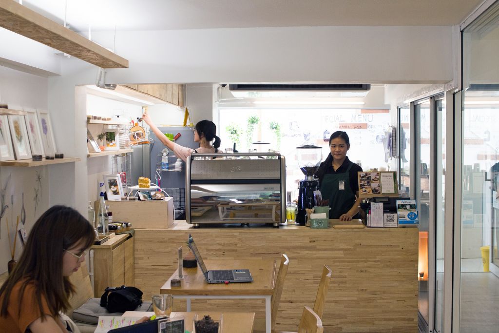 ร้าน Grasstonomy ร่มรื่นด้วยสีเขียวจากต้นไทร แซมด้วยเฟินเขากวางโดยรอบ ในอดีตตึกนี้เป็นตึกร้าง แล้วมีการรีดีไซน์โดย เทิดศักดิ์ เตชะกิจขจร อาจารย์คณะสถาปัตยกรรมศาสตร์ จุฬาฯ ซึ่งออกแบบชั้น 2-5 เป็น service office ให้ธุรกิจ start up เข้ามาเช่าใช้พื้นที่