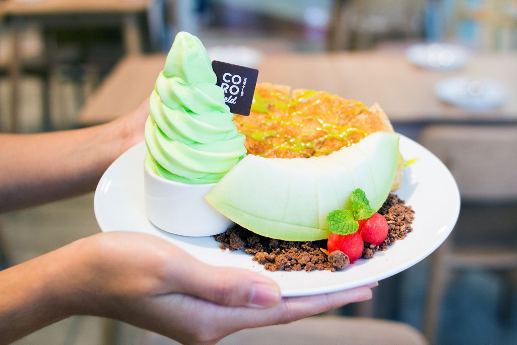 อิ่มจากจานอร่อยต่อด้วยของหวานกันเลย โทมิเมล่อนครัมเบิลดิน หรือโรตีกับไอศกรีมเมล่อนนั่นเอง ไอศกรีมรสเปรี้ยวๆ หวานๆ ตัดกับความกรอบของโรตีและความกรุบของครัมเบิลได้อร่อยลงตัว อีกถ้วยเป็นเต้าฮวยมันม่วงเคี้ยวหนุบหนับในน้ำเชื่อม เย็นชื่นใจ